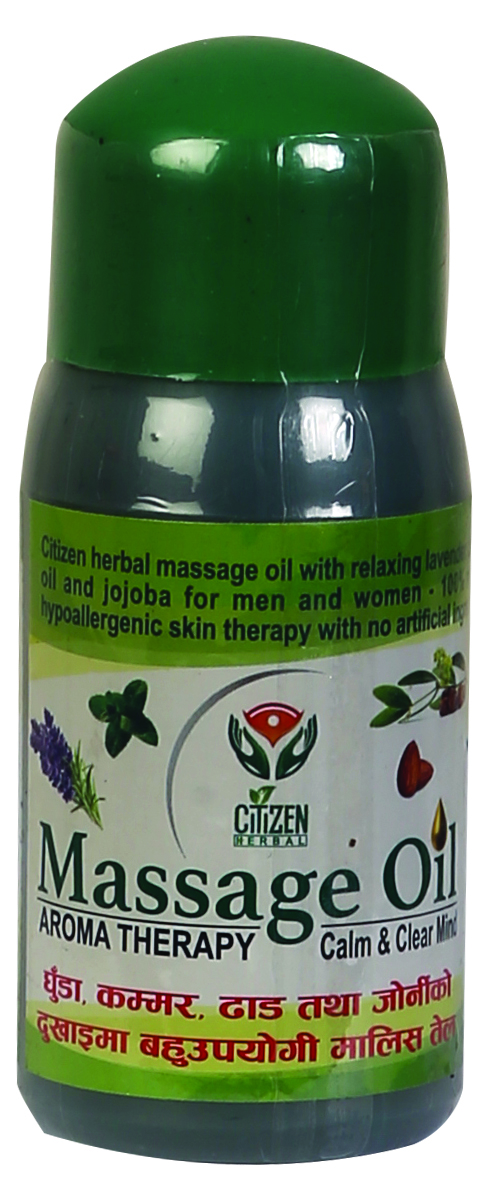 मसाज तेल कुट्की, ज्वानो, मेन्था, कपुर, घसिंग्रे तेल, महानारायण तेल,दालचिनी तेल आदिजस्ता जडिबुटीहरुको समिश्रणबाट आयुवेंदिक पद्दती अनुसार तयार पारिएको मसाज तेल हो । यसको प्रयोगले विभिन्न किसिमको दुखाईलाई तुरुन्तै कम गर्नुको साथै नशाहरुमा रगतको संचार बढाउँछ । यसको प्रयोगले शरीरका विभिन्न सुन्निएको भागमा पूर्णतया हटाउनुको साथै विभिन्न किसिमका नशा सम्बन्धी रोगहरु जस्तै नशा खुम्चिएको , नशा च्यापिएको आदि रोगहरुमा अत्यन्तै प्रभावकारी छ । यो तेल सड्के मड्केकोमा अति नै उपयोगी छ । यसको प्रयोगले हड्डीलाई बलियो बनाउने, मांसपेशीहरुलाई शतिm प्रदान गर्ने तथा हड्डी सम्बन्धी रोगहरु जस्तै वाथ,कम्मर तथा ढाड दुख्ने, गर्धन दुख्ने, युरिक एसिडको कारणबाट हुने जोर्नी दुखाई आदि रोगमा अति प्रभावकारी छ ।